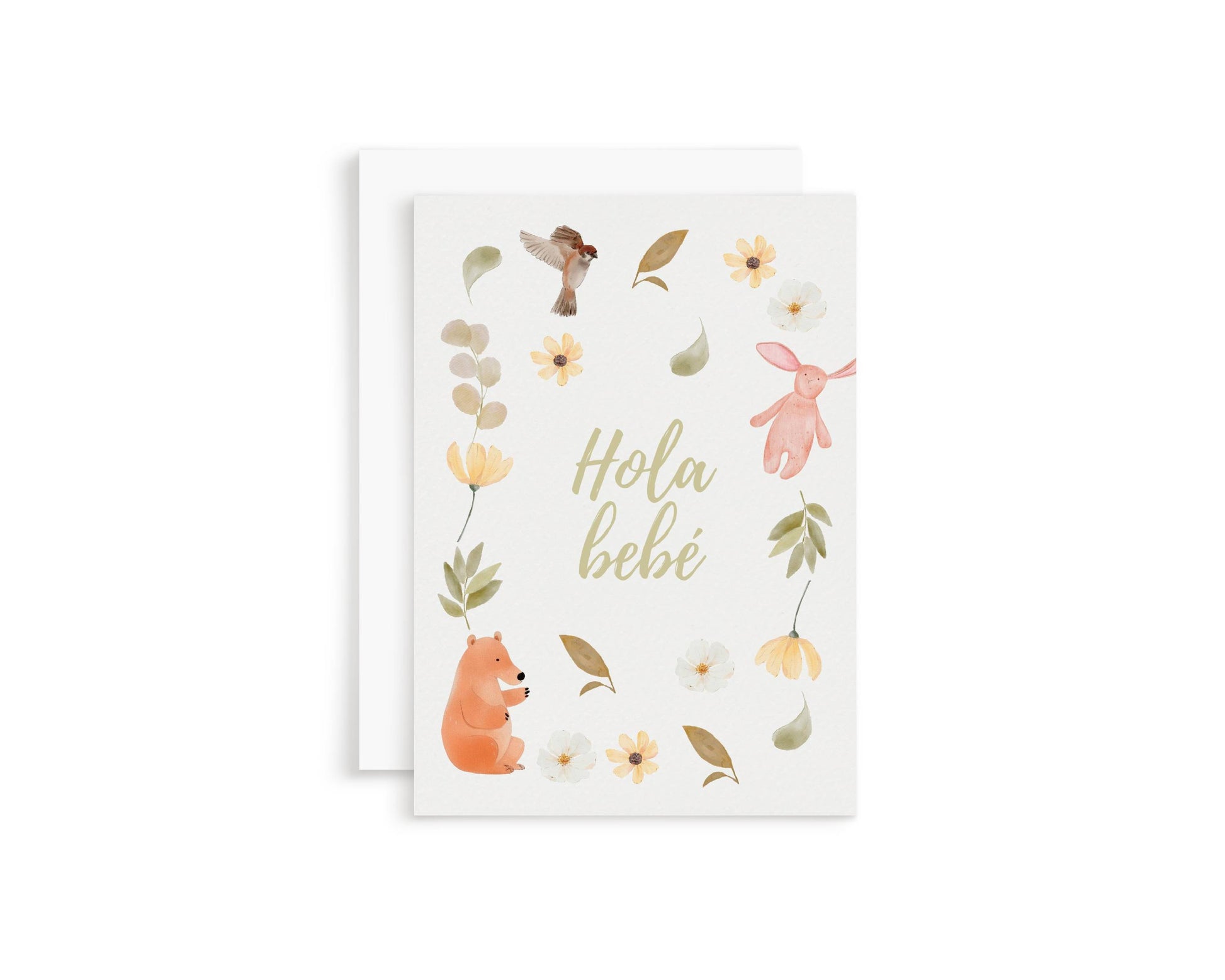 Welcome the newest member of the familia with our adorable 'Hola Bebé' greeting card in Spanish. This gender neutral card, designed for new parents, is a sweet way to say hello to the little one and offer your warmest wishes. Share the joy of this special moment in Spanish!"