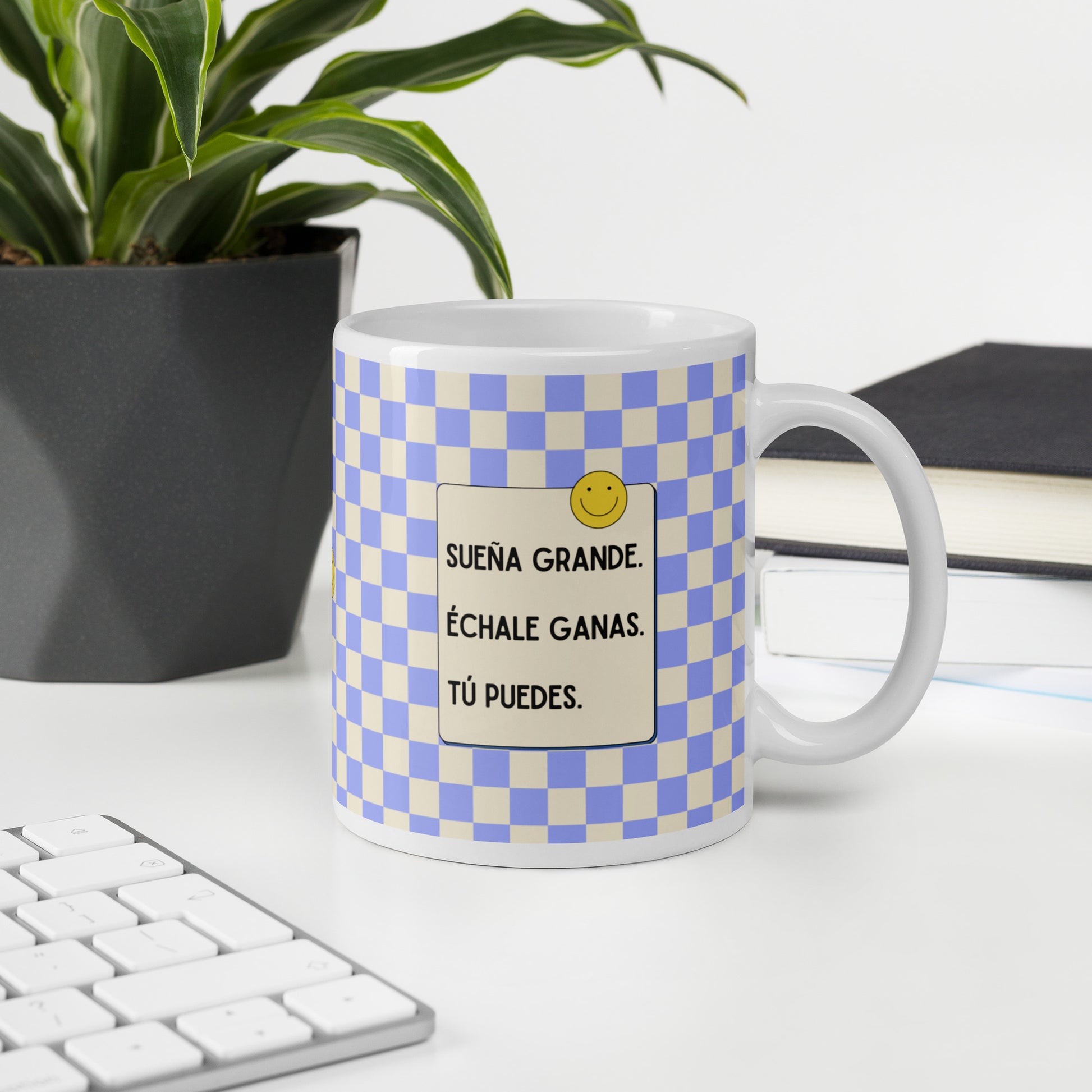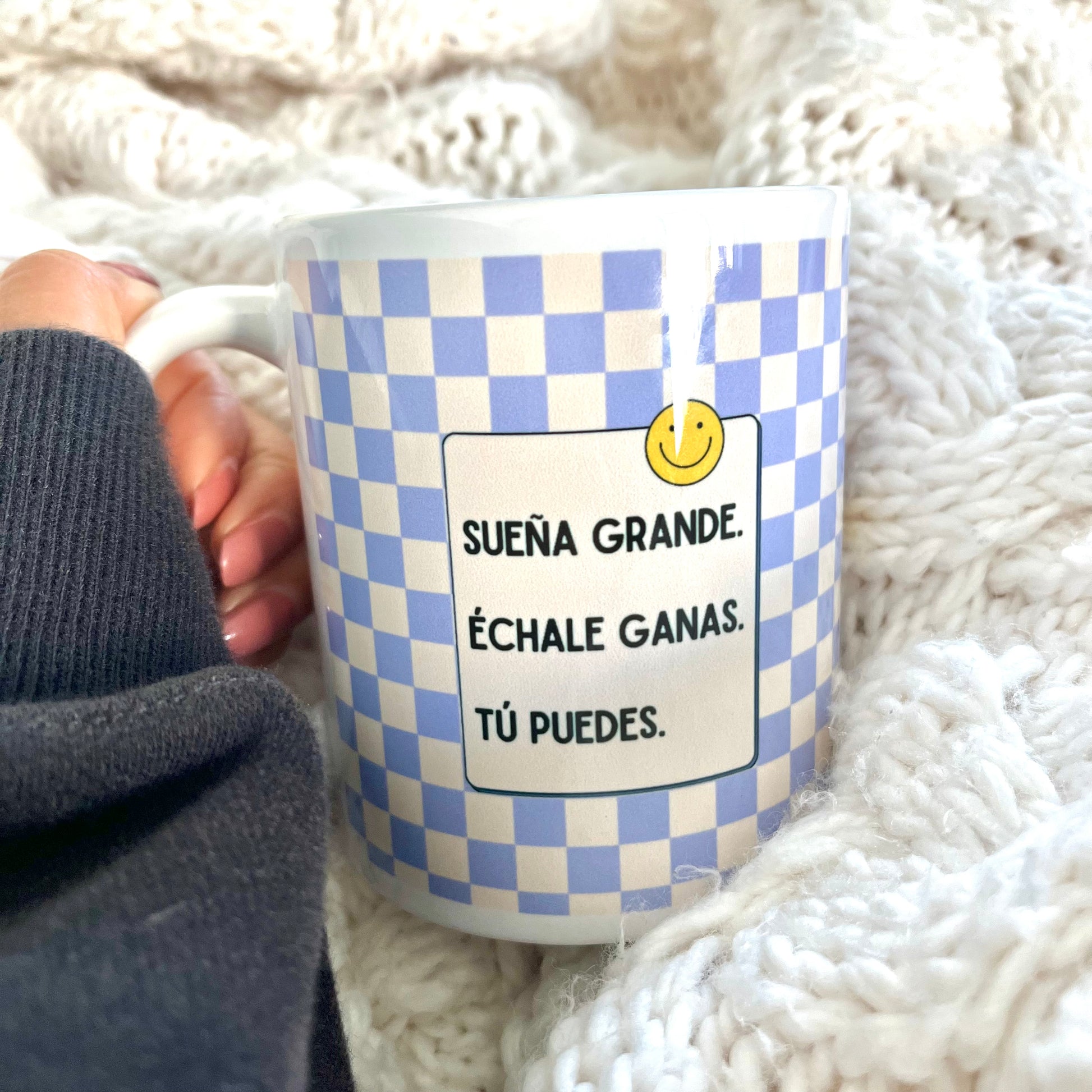 Your cafecito or tea with a side of Spanish motivation. This mug reminds you "Sueña Grande, Échale Ganas, y Tú Puedes."